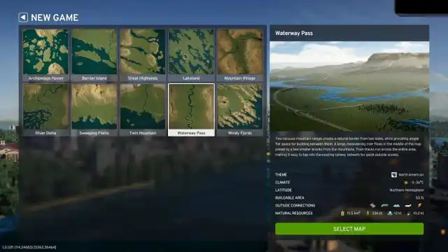 Antes de comenzar una ciudad, puedes elegir entre 10 mapas, y algunos son más difíciles de trabajar que otros, ya que presentan diferentes desafíos topográficos. Además, algunos tienen más recursos que otros, mientras que algunos tienen más conexiones prediseñadas que otros.
