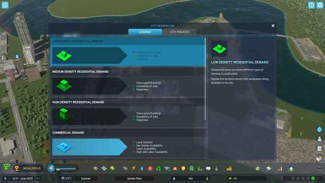 Vistas de información es el ícono «I» en la parte superior izquierda de la pantalla; También puede acceder a este menú presionando “I”. Aquí puedes ver estadísticas sobre cada elemento de tu ciudad. Lo uso principalmente para las necesidades de electricidad y agua, pero encontrarás más información sobre contaminación, tráfico, felicidad, riqueza y todos los aspectos relacionados con el funcionamiento de una ciudad exitosa.