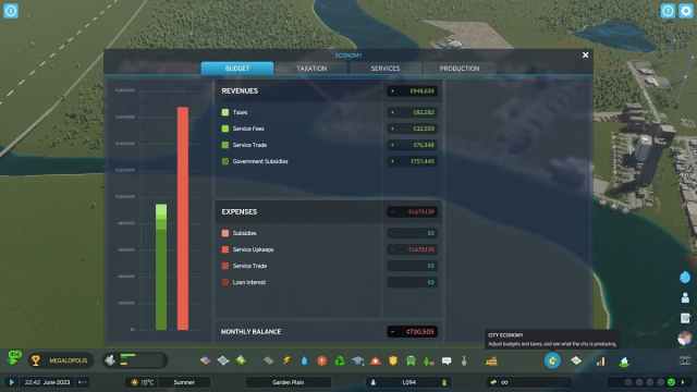 Esté atento a la página de economía de su ciudad haciendo clic en el ícono de dinero y centavo en la parte inferior derecha de la pantalla o presionando «Z». Aquí puede ver todo, desde impuestos y tarifas de servicio hasta el mantenimiento del servicio y las tasas de interés de los préstamos. Estarás en números rojos por un tiempo, así que no te preocupes demasiado, pero a medida que aumentes tu población, irás avanzando hacia el verde.