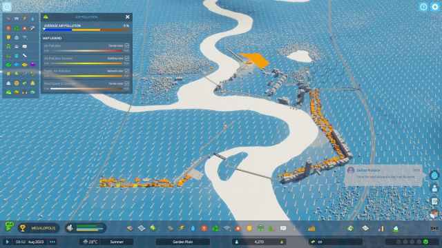 Minimizar la contaminación desde el principio, entonces, es una buena idea. Mientras construye, esté atento a los paneles de información sobre la contaminación del aire, el suelo, el agua y el ruido. Puede acceder a ellos presionando «I» o haciendo clic en «I» en la parte superior izquierda y luego eligiendo una de las cuatro opciones en la parte inferior del menú.