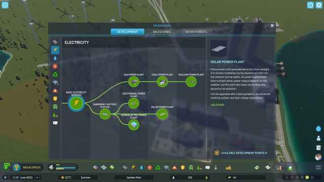 Los puntos de desarrollo te dan acceso a edificios adicionales que mejoran tu ciudad. Puedes comprar nuevos elementos colocables como parques y universidades u obtener acceso a opciones de transporte masivo como aeropuertos y metro. Por ejemplo, a mí me gusta poner puntos en la pestaña Electricidad para conseguir la Planta de Energía Solar. Esto me da más opciones de energía verde para mantener baja la contaminación.