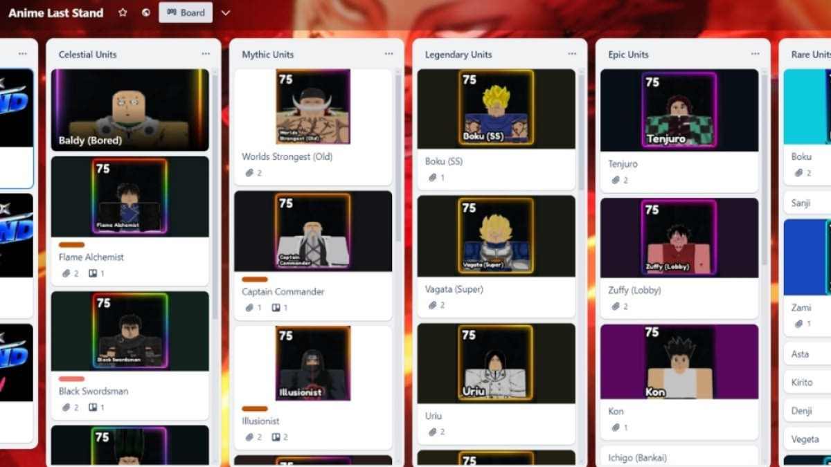 Es muy fácil usar el tablero Trello de Anime Last Stand para encontrar la información exacta que necesitas. Por ejemplo, si quieres saber qué unidades legendarias existen en el juego, necesitarás buscar la columna Unidades legendarias. Una vez que lo encuentre, puede desplazarse y ver qué unidades puede conseguir.