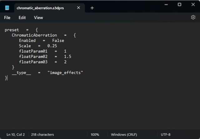 - Siga los mismos pasos anteriores y en el efectos_de_camara_predeterminados carpeta crea otro archivo llamado aberración_cromática.s3dprs