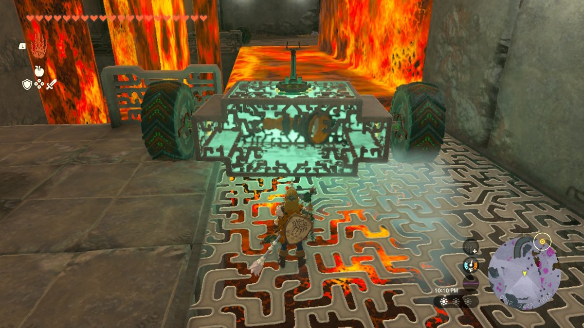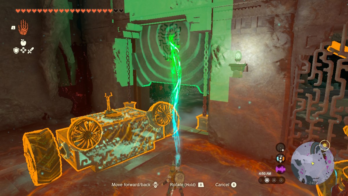 - En la siguiente zona tendrás que cruzar un flujo de lava. Utilice Ultrahand para colocar dos ruedas grandes y una palanca de dirección en el contenedor, convirtiéndolo en un vehículo improvisado.