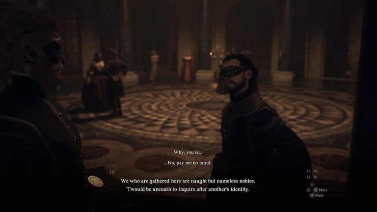 El Sovran deja el balón con una puerta secreta en la parte trasera así que repasemos la búsqueda y encontremoslo. Primero, para asistir a la Mascarada debes estar en el salón de baile al atardecer. Me pondría la ropa y la máscara antes de entrar y sabrás que el evento ha comenzado oficialmente si se reproduce una escena. La escena mostrará a los clientes en el salón de baile y una misteriosa figura falsa de Sovran yendo a una de las trastiendas.