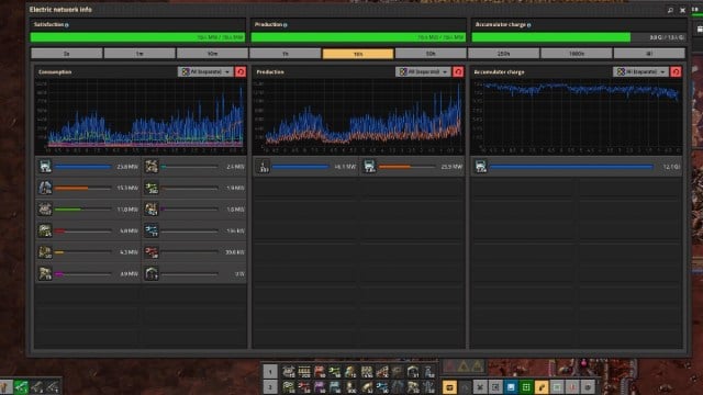 Siempre querrás ver la información de la red eléctrica abriendo cualquiera de tus líneas eléctricas. Presta atención a los picos de energía y asegúrate de tener suficiente. Una buena medida es ver que las líneas azules cuadriplican todo lo demás en su red. Si no tienes una gran línea de producción, no te quedarás sin energía. E incluso si tienes una fábrica grande, siempre que llenes 1/6 de la isla en acumuladores y tengas cada centímetro cubierto con pararrayos, deberías estar bien.