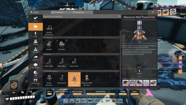 Una vez que haya encontrado el pozo de recursos de gas nitrógeno utilizando el escáner de recursos, coloque el presurizador del pozo de recursos sobre él y conéctelo a la corriente. Comenzará a extraer los recursos, pero debes construir los extractores de pozos de recursos en cada uno de los pequeños pozos que rodean el presurizador. Cada pequeño pozo puede tratarse como un nodo de recursos sin procesar con un Miner Mk. Los pozos de recursos de gas nitrógeno tienen al menos siete pozos que puedes extraer.