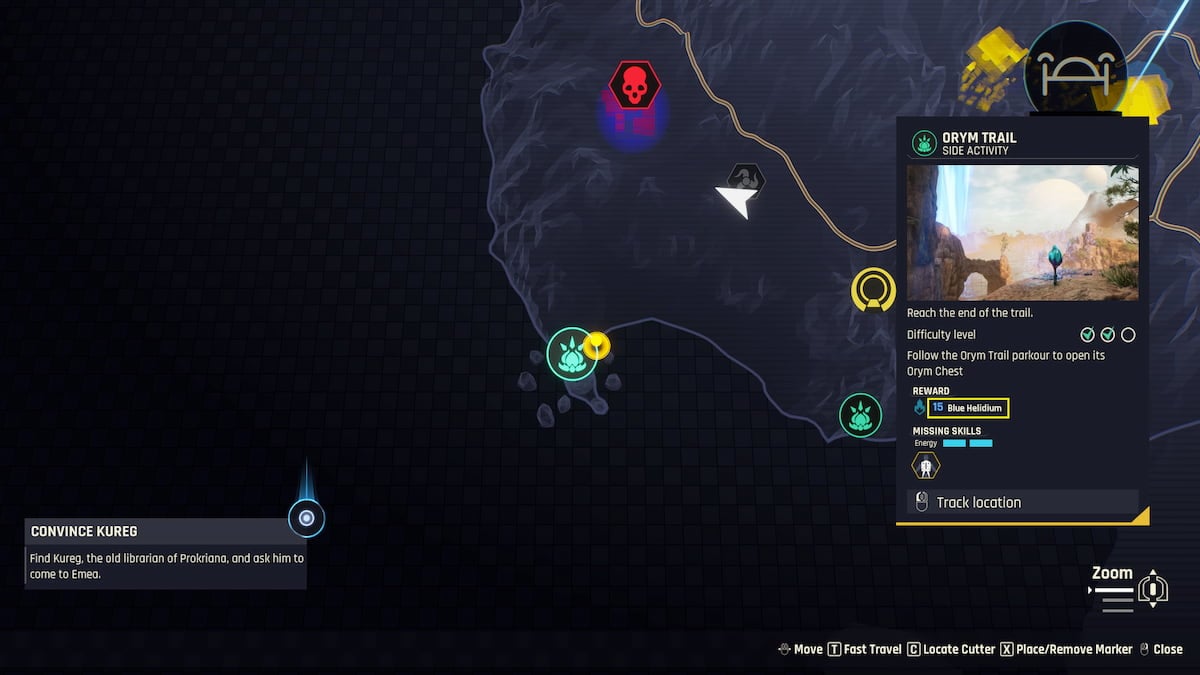 Blue Helidium funciona un poco diferente a los otros dos porque desbloquea más habilidades Jetpack. Si quieres ampliar tus técnicas con el Jetpack, como impulsar más rápido y tener una carga más larga, necesitas Blue Helidium. Obtienes helidio azul por abriendo cofres y, con mayor frecuencia, por completando misiones. Las misiones principales, las misiones secundarias y las actividades secundarias te recompensarán con una cantidad específica de helidio, como se indica en el menú de misiones (que se muestra en la captura de pantalla que incluí arriba). Cuantas más misiones completes, más helidio podrás abastecer para mejoras.