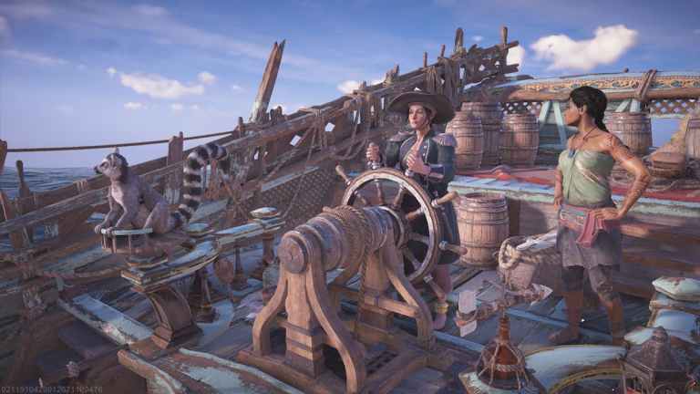 Character at the wheel with crewmate and pet.