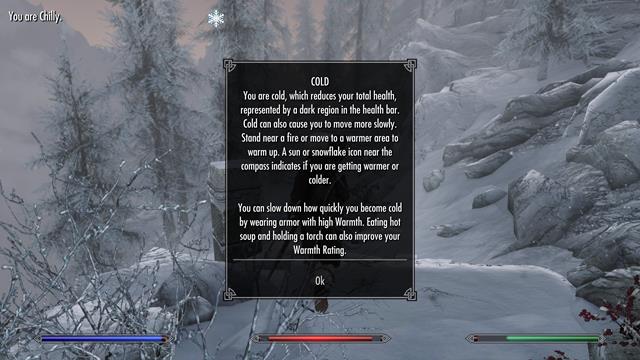 Frío versus calor Los climas y el tiempo son probablemente los dos factores más importantes a considerar si tienes habilitado el Modo Supervivencia en Skyrim. Explorar en el frío disminuir su salud total, y nadar en aguas heladas exacerbará este efecto. Al final, tu personaje simplemente morirá.
