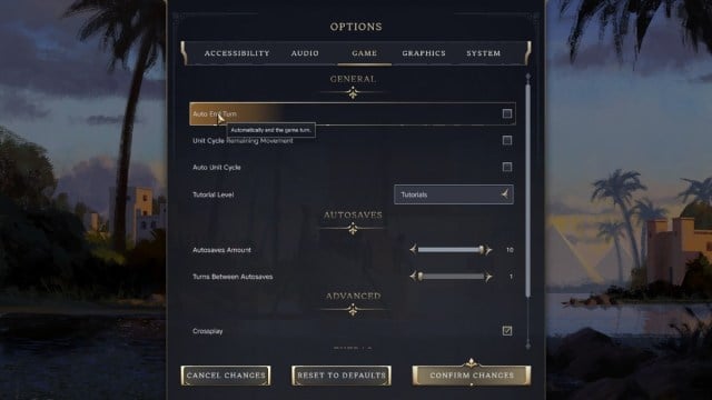 También hay una función de «Auto End Turn» en la configuración de la pestaña del juego. Esto termina específicamente el giro automáticamente una vez que se cumplen todas las acciones. Entonces, al mover unidades, puede ordenar que esas unidades muevan un par de fichas más de lo habitual para que tengan algo que ver con los próximos turnos.