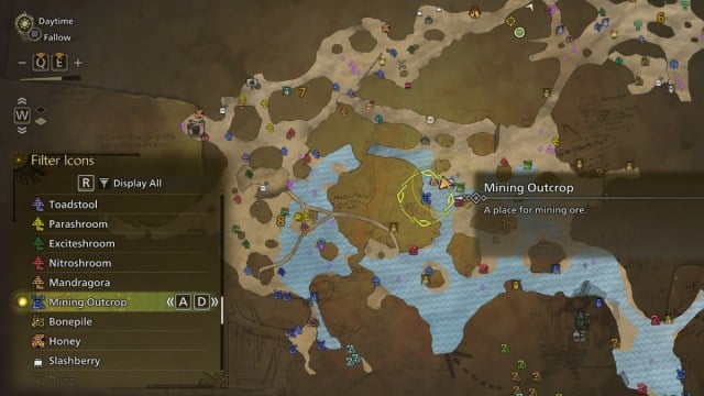 For at søge efter minedrift i en hvilken som helst region skal du åbne det detaljerede kort og trykke på den tilsvarende knap for indstillingen i nederste venstre hjørne af skærmen. Navigere Filter ikoner for at vise et filter. Rul ned, indtil du ser Udgravning af minedrift på listen. Det vil vise nærliggende minedriftspositioner på kortet. Rul til højre for at cykle gennem alle tilgængelige placeringer for minedrift.