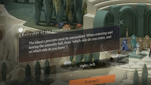 En el Capítulo 5, etapa 9, Un repaso de lo esencial te interroga sobre lo siguiente: “Los preceptos de la isla deben memorizarse. Al entrar y salir del salón de actos, ¿por qué lado entras y por qué lado sales?