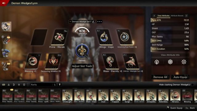 Dämonenkeile sind eines der wichtigsten Ausrüstungssysteme im Spiel. Jeder Dämonenkeil verleiht bestimmte Werte und Boni, die euren Charakter stärken. Jeder Charakter verfügt über acht Dämonenkeil-Slots. Ihr müsst nicht alle acht Dämonenkeile ausrüsten, da jeder einen Punktwert oder eine Toleranz besitzt. Ihr könnt die Toleranzgrenze eures Charakters nicht überschreiten. Daher solltet ihr die Dämonenkeile auswählen, die am besten zu eurem Charakter-Build passen.