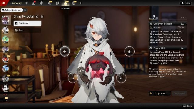 Zu guter Letzt gibt es noch die Geniemon-Unterstützungen. Kurz gesagt, Geniemons sind ausrüstbare „Begleiter“, die Unterstützungsfähigkeiten bieten, darunter auch passive. Manche geben dir einfach mehr Verbrauchsgegenstände und erhöhen gleichzeitig einen Wert leicht, während andere sehr spezifisch sind, wie z. B. die Erhöhung des Pyro-Angriffs des Hauptcharakters. Dies sind zwar nur geringfügige Statusverbesserungen, aber sie sind dennoch wichtig, wenn du alles optimieren willst.
