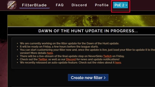 Um Filterblade von NeverSink zu installieren, gehen Sie zu deren Website und melden Sie sich bei Ihrem Exile Path-Konto an. Sobald die Verbindung hergestellt ist, gehen Sie hinüber und stellen Sie sicher, dass Sie die Version auf PoE 2 ändern, wie im Bild oben gezeigt.