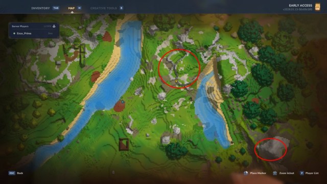 Zuerst benötigst du Kupfererz, um es zu Kupferbarren einzuschmelzen. Kupfererz findet sich in der Regel in Bergregionen. Da die Welten prozedural generiert werden, öffnest du einfach die Karte, suchst nach felsigem Gelände und betrittst es, wie im Bild oben gezeigt.