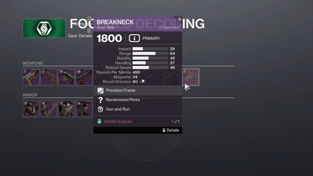 - Decodificación enfocada en The Drifter. La forma más consistente de obtener Breakneck es enfocar tus Gambit Engrams en The Drifter. Solo cuesta un engrama por Breakneck, y obtienes muchos simplemente jugando partidas de Gambito. Por supuesto, es necesario que realmente jugar Gambit, que no es un destino que le deseo a nadie, pero si lo disfrutas, hazlo todo. También debo mencionar que no necesitas ganar tus partidas para obtener Gambit Engrams, solo complétalos. No lo tomes como una invitación a hacer sacos de arena o AFK, pero ser pisoteado no afectará tus posibilidades de ser un Breakneck.