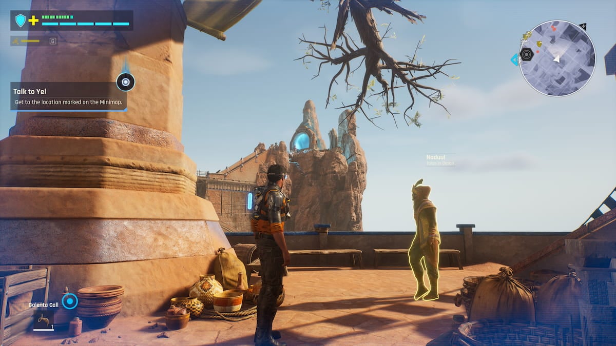 Desan es un lugar complicado para navegar, pero puedes encontrar el pergamino del aldeano de Talon, Naduul. Afortunadamente, para llegar hasta él, sólo necesitas volar directamente. abajo y a la izquierda del punto de viaje rápido de Daoka. Él está caminando de un lado a otro en un balcón con pancartas coloridas.
