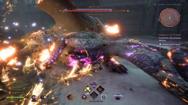 A medida que abres la puerta gigante y continúas avanzando, encontrarás que el demonio ha poseído un dragón no-muerto. El Sin Forma es un jefe dragón de nivel 40, contra el que solo debes luchar si tienes el nivel 35 o superior.