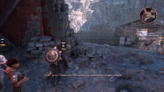 Seguir esta ruta lo llevará al vendedor de papel en la sección Shoreline Passage de Minrathous, y encontrará notas en cada mesa en esta área. Interactúa con la nota del lado derecho y habrás encontrado tu tercera pista.