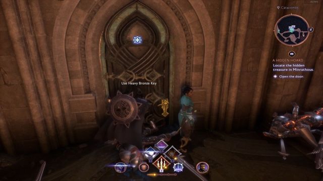 Usa la llave de bronce pesada y abre la puerta antigua. Abre los cofres del interior y completa la misión secundaria Un tesoro oculto para obtener las siguientes recompensas: