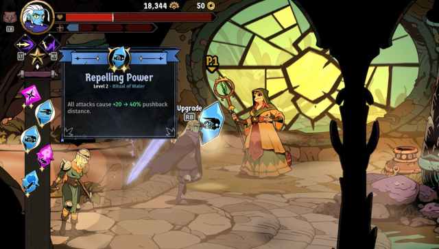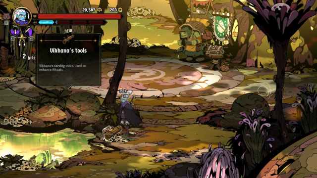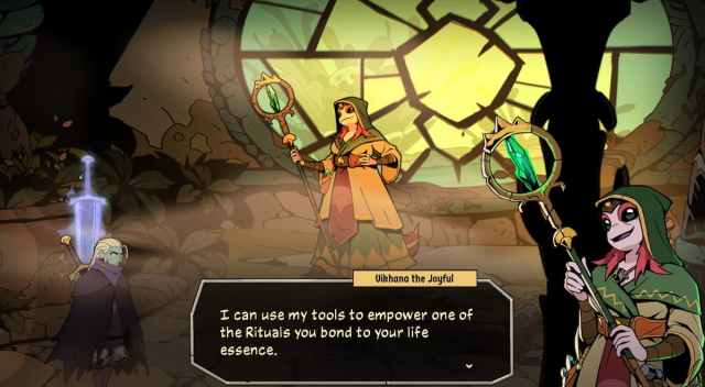 में विखाना से बात करें और उसे वे औज़ार दें। वह उनका सदुपयोग करने का वादा करेगी। जब आप विखाना को औज़ार देते हैं तो क्या होता है? विखाना को उसके औज़ार देने के बाद, संभावना है कि वह आपके रन के दौरान किसी गैर-बॉस रूम में आपके द्वारा वर्तमान में प्राप्त किए गए किसी यादृच्छिक अनुष्ठान को बढ़ाने के लिए प्रकट होगी। ऊपर दिए गए उदाहरण में, विखाना ने मेरे विकर्षक शक्ति अनुष्ठान को स्तर 2 तक उन्नत किया, जिससे उसके गुण काफ़ी बढ़ गए। उसे ज़बरदस्ती प्रकट करने का कोई तरीका नहीं है, और जहाँ तक मैं देख सकता हूँ, यह काफ़ी बेतरतीब है। हो सकता है कि वह दौड़ के दौरान प्रकट न हो, लेकिन फिर भी उसे उपकरण देना उचित है ताकि आप ये दुर्लभ लेकिन उपयोगी अपग्रेड प्राप्त कर सकें।