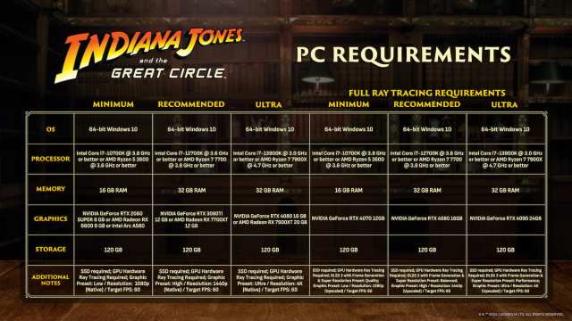 इंडियाना जोन्स और ग्रेट सर्कल सिस्टम आवश्यकताएँ