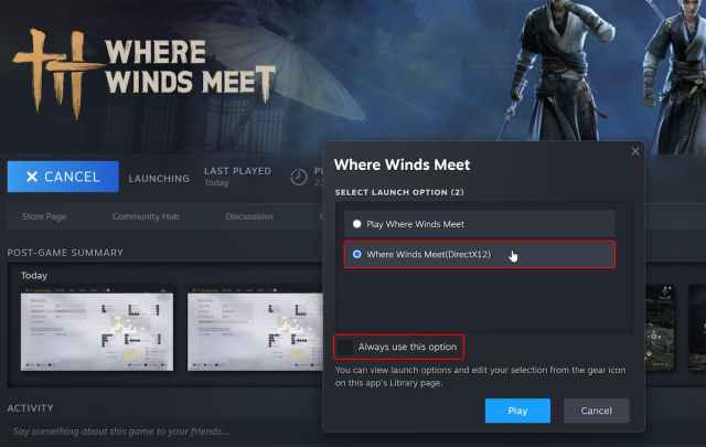 - चुनना “जहाँ हवाएँ मिलती हैं (DirectX12)“और जांचें”हमेशा इस विकल्प का प्रयोग करें“और फिर दबाएँ खेल बटन।