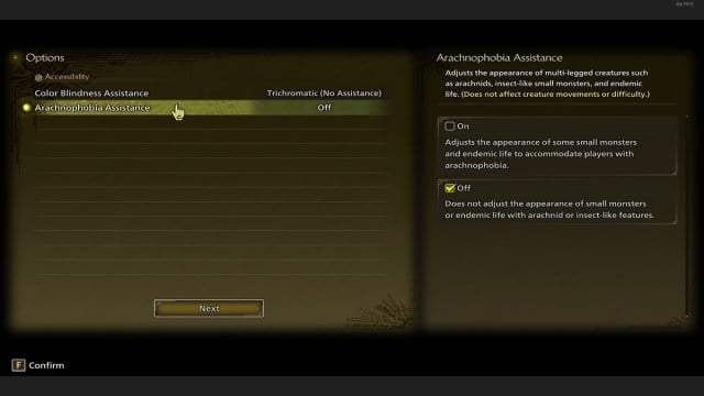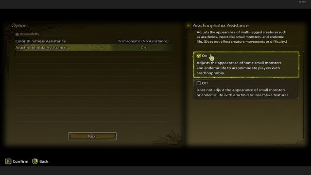 Puoi trovare il Opzione di supporto per l’aracnofobia sotto l’opzione daltonico nell’Accessibilità. Tutto quello che devi fare è modificare l’opzione da “Off” a “On”. e il gioco farà del suo meglio per non spaventare i giocatori aracnofobici con mostri simili a ragni dall’aspetto realistico.