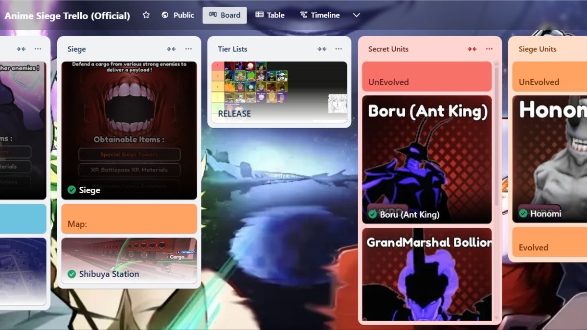 Una delle migliori risorse per aiutarti a rimanere aggiornato sugli ultimi sviluppi e sulle funzionalità del gioco è il sito ufficiale Bacheca Trello di Anime Siege. Questa dashboard fornisce un hub organizzato e trasparente che evidenzia le informazioni più importanti, in modo che i giocatori si sentano coinvolti e adeguatamente aggiornati. Lo spazio è facile da navigare e qui trovi le categorie più utili: