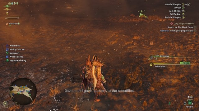 이것은 검은 불꽃에 속하며, 여러분의 캐릭터는 이를 스카우트 파리에게 전달하여 몬스터의 웨이포인트를 발견하게 됩니다. 검은 불꽃은 15구역에 있습니다.자동으로 실행되지 않으면 경유지를 설정하고 Seikret을 통해 더 낮은 수준으로 순환하세요. 플레이어가 아이템 가방을 빨리 보충해야 하는 경우 Area 9에 사용할 수 있는 팝업 캠프가 있습니다.