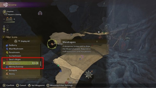 맨드레이크는 Scarlet Forest, Orchard Cliffs 및 Wyverian Ruins에서만 나타납니다. 스폰을 많이 하고 싶다면 붉은 숲이 가장 좋지만, 좀 더 집중된 지역을 원한다면 와이베리아 유적지가 더 좋을 것 같습니다. 다음을 사용할 수도 있습니다. Dot ESPORTS의 Monster Hunter Wilds 인터랙티브 맵 리소스를 쉽게 필터링합니다.