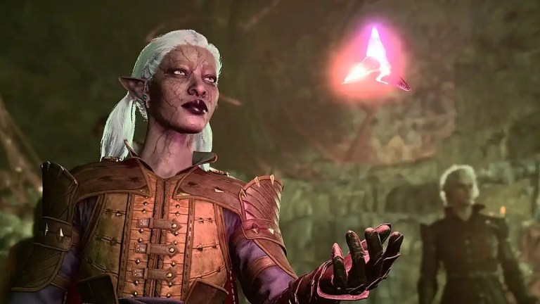 drow mage in baldurs gate 3 looking at a magic rune