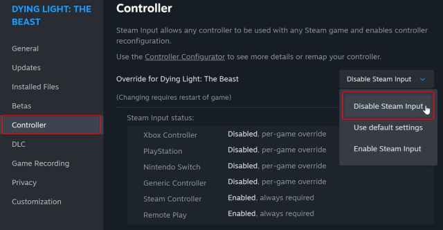 Luz de muerte: la bestia ofrece soporte nativo para los controladores de Xbox y PlayStation en la PC, lo que permite a los desarrolladores configurar perfiles individuales para cada tipo de controlador. Sin embargo, si su dualshock 4 o dualsense no funciona, esto significa que debe deshabilitar la entrada de vapor para que los perfiles correctos se carguen.