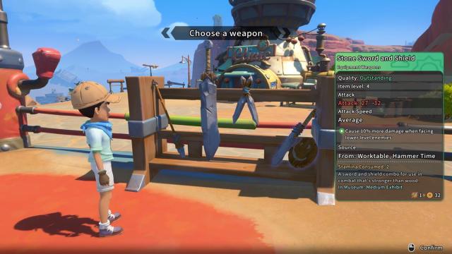 Hay cuatro armas disponibles cuando eliges comenzar combates de sparring en Mi tiempo en Sandrock. Estos incluyen Lanza de Piedra, Espada de Piedra, Dagas de Piedra y Espada y Escudo de Piedra. Personalmente prefiero la Espada y el Escudo de Piedra debido a su versatilidad. Esta combinación de equipo me permite bloquear ataques con el escudo y al mismo tiempo golpear a mi enemigo cada vez que veo una abertura.