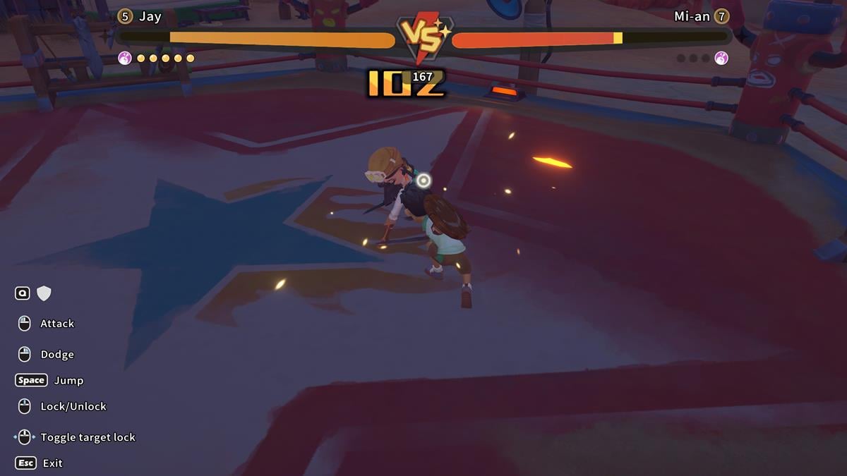 Para ganar combates de sparring en Mi tiempo en Sandrockdebes esquivar o bloquear hábilmente los ataques de tu oponente y luego romper su guardia para causar más daño.. Esta particular mecánica de juego se desbloquea al principio de la campaña, una vez que conoces a Pen, el autoproclamado héroe y protector de la aldea. A partir de ese momento, deberías ver la opción de combate cuando hables con ciertos NPC.
