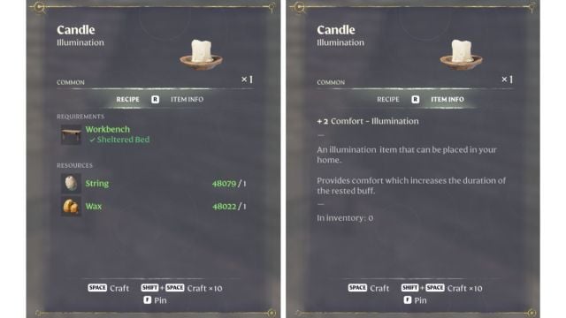 Stearinlys kan lages ved den grunnleggende arbeidsbenken så snart du har tilgang til et brannalter i Enshrouded. Disse krever bare en liten mengde av to ingredienser og har også en anstendig mengde belysning. Takket være den lille størrelsen kan lysene plasseres på stort sett alle glatte overflater, inkludert bord.