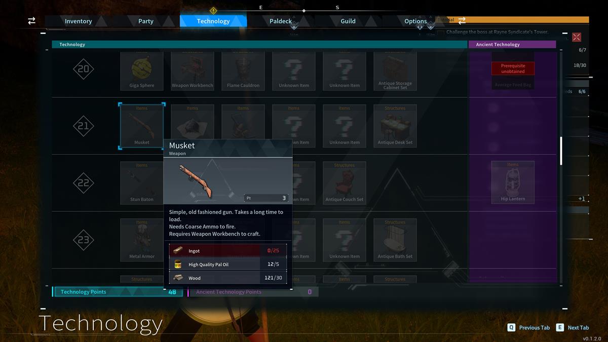 Puedes desbloquear armas en mundo pal una vez que alcances el nivel de tecnología 21. Aquí es cuando podrás gastar puntos para obtener los planos del mosquete, la pólvora y la munición gruesa.