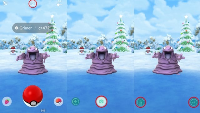 - En un encuentro, toca el contorno de la cámara en la parte superior central de la pantalla para ingresar al modo de instantánea. (Esto puede ser un poco difícil de ver con los entornos actuales con temática invernal).