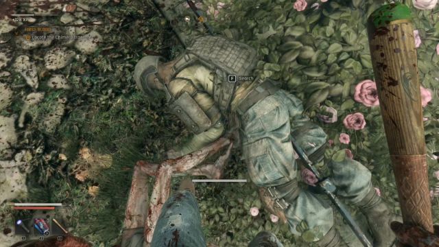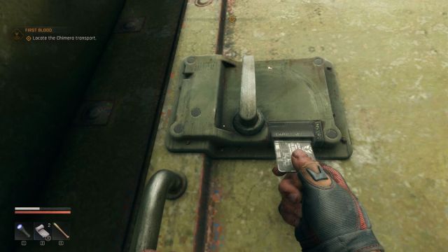 Este cartão-chave pode ser obtido após eliminar uma Mordida com equipamento militar.Você deverá ver um perto do comboio, como na captura de tela acima. Se eles não aparecerem perto do comboio, provavelmente é melhor voltar mais tarde, porque eu também não consegui encontrar nenhum imediatamente, mas retornei algumas atividades depois e ele estava lá para ser pulverizado. Reviste o corpo e pegue o cartão-chave!