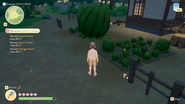 Compre nove sementes sazonais na Loja de Sementes da Felicidade (Graminova). Retorne à sua fazenda e cultive nove canteiros adjacentes em uma grade 3×3. Plante todas as sementes de melancia em uma grade 3×3 e certifique-se de controlar as ervas daninhas para que todas cresçam naturalmente ao mesmo tempo. Se você deixar as ervas daninhas retardarem seu crescimento, elas podem não crescer juntas a tempo. Você também pode colocar uma gaiola de coelho por perto para ajudar a limpar as ervas daninhas.