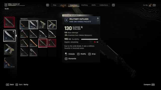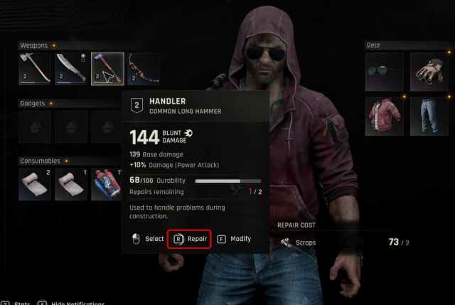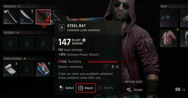 Cada arma em Dying Light: The Beast tem um valor de durabilidade, que diminui à medida que você a usa. Para consertar uma arma, abra seu inventário em qualquer ponto e passe o mouse sobre ela. Em seguida, segure R para consertá-la e restaurar sua durabilidade total, usando alguns restos no processo.