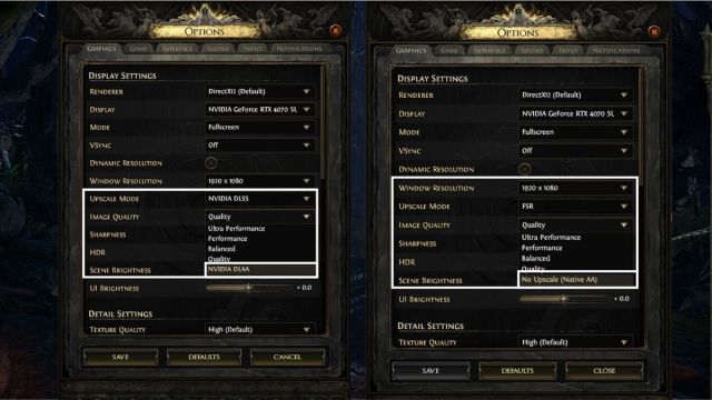 Se você jogar em uma resolução superior a 1080p, recomendamos o uso de upscaling. Além de DLSS, XeSS e FSR, Path of Exile 2 também oferece suporte a NIS, também conhecido como Nvidia Image Scaling, que pode ser usado por proprietários de NVIDIA que possuem uma GPU RTX. No entanto, em meus testes, o NIS parece pior do que DLSS, FSR e XeSS quando definido para a predefinição Qualidade.