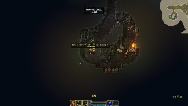 O processo de desbloqueio é simples. Durante um dos estágios listados abaixo, explore completamente a área enquanto fica de olho no seu minimapa (e no mapa maior) até encontrar um NPC amigável representando uma classe bloqueada. Basta interagir com eles uma vez e você verá uma mensagem informando que a respectiva classe foi desbloqueada. Por exemplo, aqui estou conversando com um NPC representando a classe Rogue que mais tarde também aparecerá na área central principal.