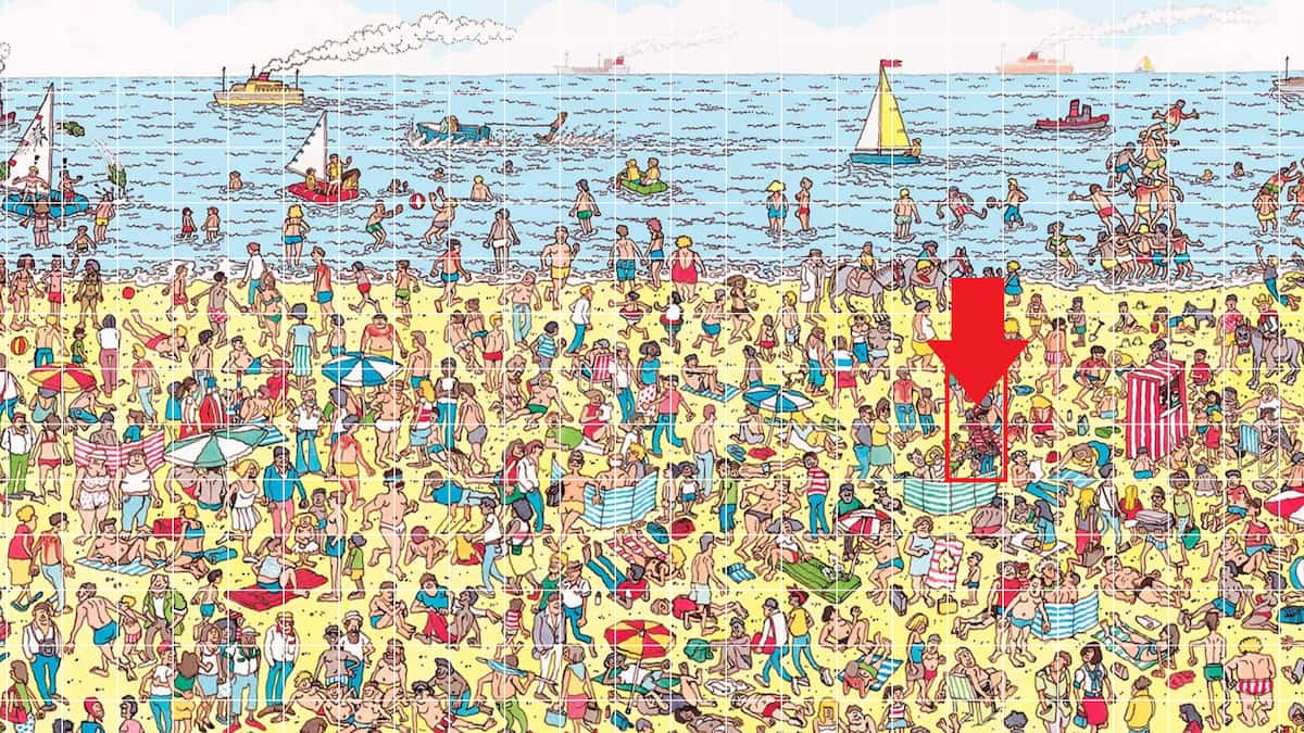 Independentemente de você estar familiarizado ou não com o clássico jogo “Onde Está o Wally?”, encontrar esse sujeito em meio a um mar de outros personagens é bastante complicado. Se este nível o deixou perplexo, veja como encontrar o Wally para passar do Nível 11 em I’m Not a Robot. Dicas e Sugestões para Encontrar o Wally em I’m Not a Robot Um grupo de pessoas na praia com o Wally escondido entre elas em I’m Not a RobotSe você quiser explorar um pouco antes de descobrir a localização do Wally, aqui estão algumas dicas e sugestões para te guiar na direção certa. Mas não se preocupe, pois também lhe daremos a localização exata dele. Waldo é um homem razoavelmente alto, com cabelo castanho-escuro, óculos escuros, calça jeans azul, camisa listrada vermelha e branca e um gorro. Sua camisa listrada é a maneira mais fácil de distingui-lo de outros personagens, então concentre-se em procurá-la. Waldo não aparece na água e pode ser encontrado em algum lugar na praia arenosa. Waldo está de pé, não sentado. Waldo está bem ao lado de uma família segurando um bebê e uma toalha. Waldo está perto da barraca listrada e branca, perto do canto superior direito da praia. Waldo está perto do canto superior direito da praia. Localização de Waldo em Eu Sou um Robô. Você pode encontrar Waldo perto do canto superior direito do mural da praia. Ele está de pé ao lado de uma família segurando uma toalha listrada azul-clara. Parte de seu corpo está escondida atrás dele, tornando-o muito difícil de ser visto. Há muitos itens listrados vermelhos e brancos espalhados pela praia, então sua camisa característica também não é fácil de ser vista.