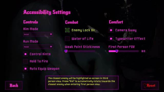 Se estiver tendo dificuldades para mirar corretamente, principalmente com um controle, você pode ativar o botão “Bloqueio inimigo ativado”, que serve essencialmente como um alvo automático. Embora isso elimine um pouco do desafio divertido do jogo, também não é um obstáculo.