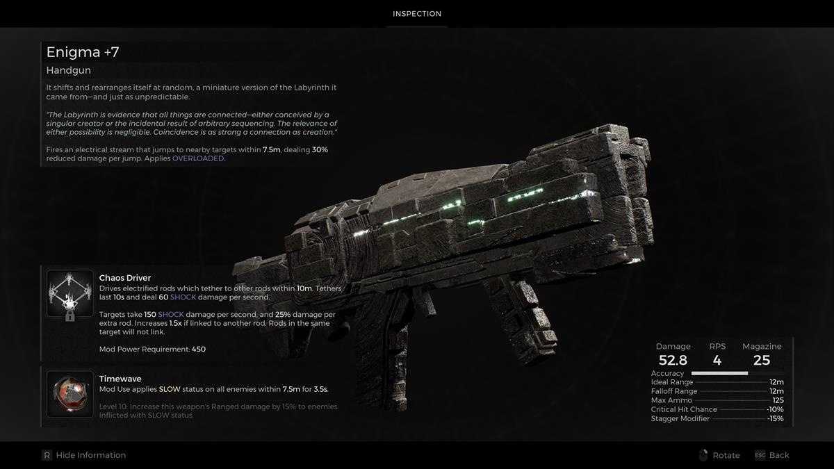 - Pistola: Enigma — El Enigma sigue siendo una de las mejores armas para el ritualista en Resto 2: El Rey Despertado debido a su daño de área de efecto, donde una cadena de rayos atraviesa a los enemigos cercanos. Su modo de disparo alternativo también causa daño elemental de choque de forma constante durante toda la duración.