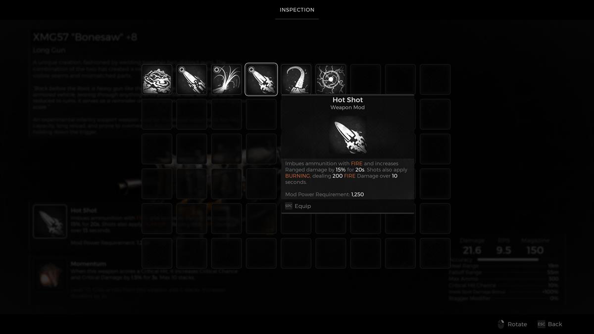 - Mod de arma de fuego n.° 1: disparo caliente o rondas corrosivas – Realmente no puedes equivocarte con ninguna de estas selecciones. Si tienes un arma larga con una estadística alta de disparos por minuto (RPM), activar el mod garantiza que todas las balas que dispares tengan un efecto elemental.