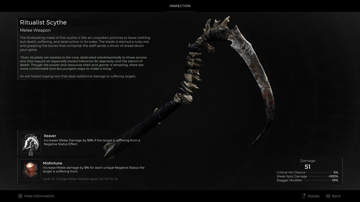 - Arma cuerpo a cuerpo: guadaña ritualista – La guadaña ritualista obtiene una mejora cuerpo a cuerpo si el objetivo sufre un efecto de estado negativo. Puedes aprender más en nuestro Guía de guadaña ritualista.